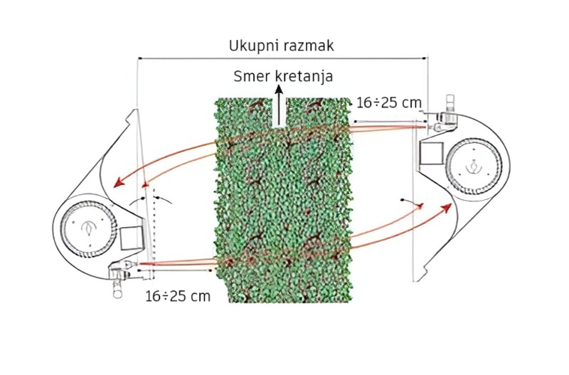 - Jednim traktorom prskaju se dva reda istovremeno. Već se tako ostvaruje usteda od 50% potrošnje goriva. Motor radi na manjim obrtajima (~1300 obrtaja), jer nije potrebna velika snaga za rad ventilatora. Na taj način se ostvaruje dodatna ušteda od oko 20% u potrošnji goriva.